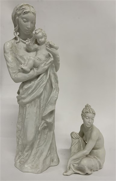 Lotto di due sculture raffiguranti madre con bimba e nudo femminile (cm h max 56)