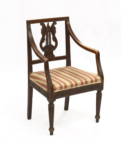 Poltrona in noce con schienale traforato e intagliato a lira, gambe anteriori tornite e scanalate. Fine secolo XVIII (difetti)