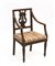 Poltrona in noce con schienale traforato e intagliato a lira, gambe anteriori t