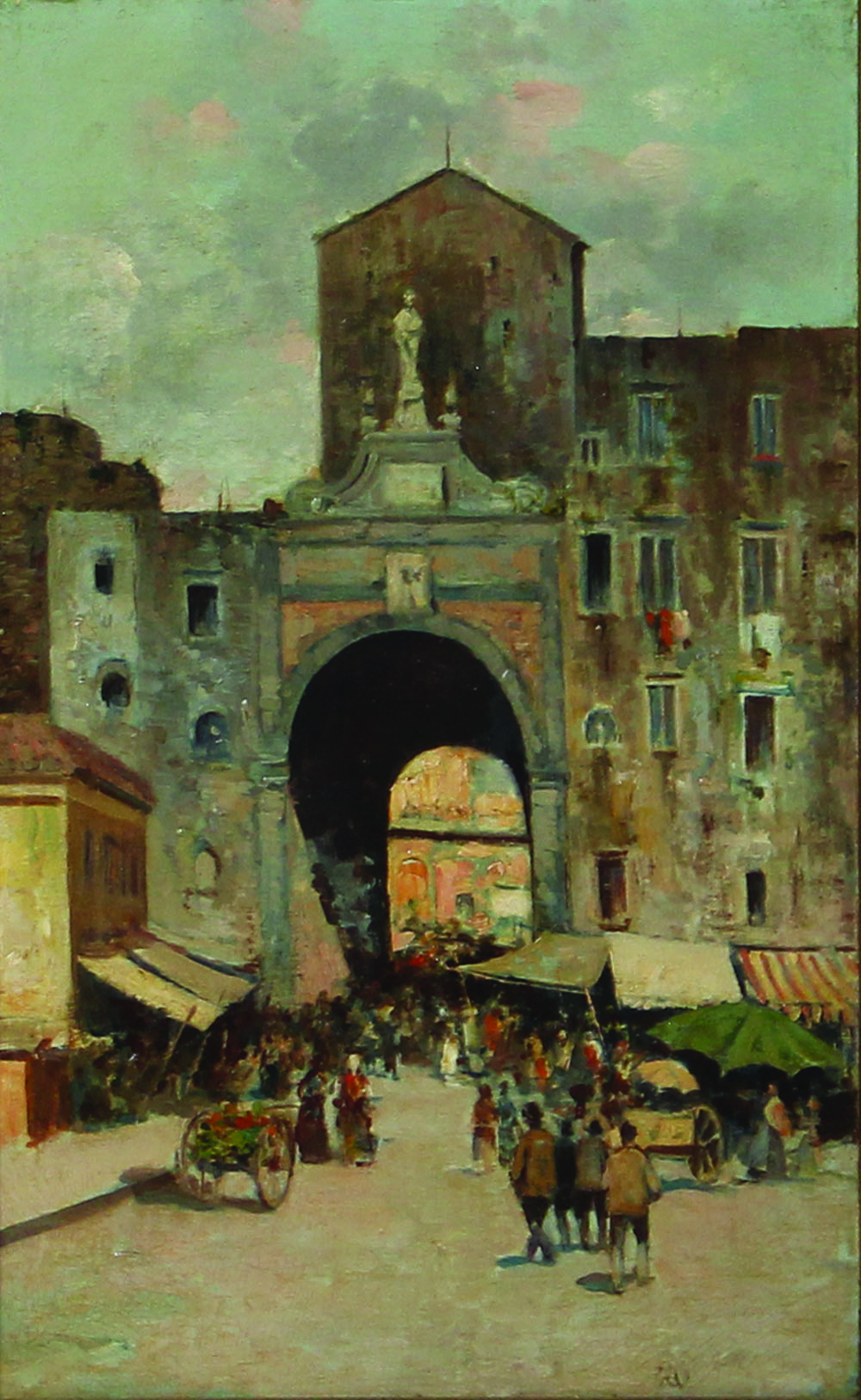 Achenbach Oswald Porta capuana olio su masonite cm 40x25,5 firma in basso a destra