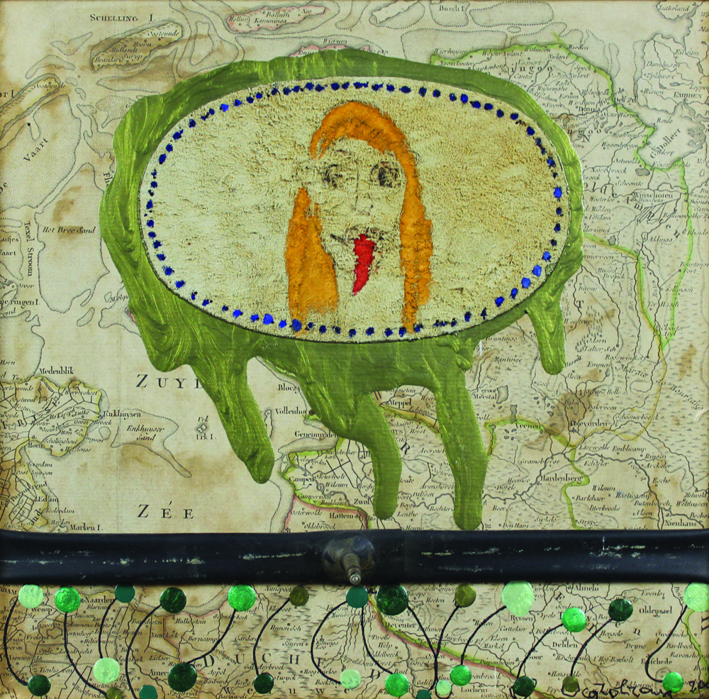 Carolrama Senza titolo, 2005 tecnica mista su carta applicata su tela e tecnica mista su cuoio applicato su carta cm 27,5x28,5 firmata e datata in basso a destra ed al retro