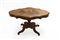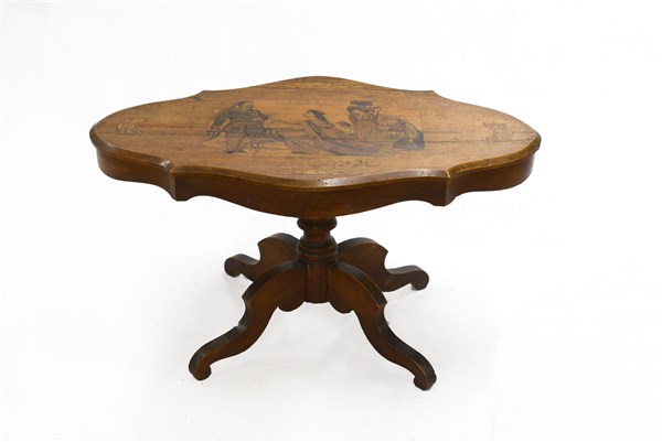 Tavolino da salotto intarsiato con al centro Vittorio Emanuele II con raffigurazione allegorica dell'Italia che gli ricorda le regioni ancora sottomesse da austriaci e barbari. Gamba centrale terminante a tre piedi sagomati. (cm 96x54x58) (difetti e mancanze)
