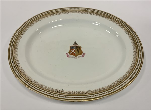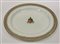 Vassoio ovale in ceramica decorato con un bordo perlato e dorato. Al centro stemma miniato in colori ed oro.