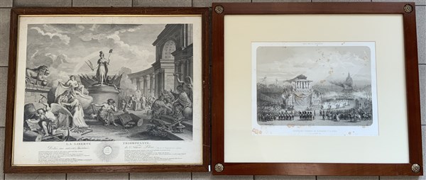 Lotto composto da grande incisione del periodo della rivoluzione francese inneggiante al trionfo della libertà e litografia inerente al ritorno delle ceneri trionfali per la salma di Napoleone. In cornici (difetti)