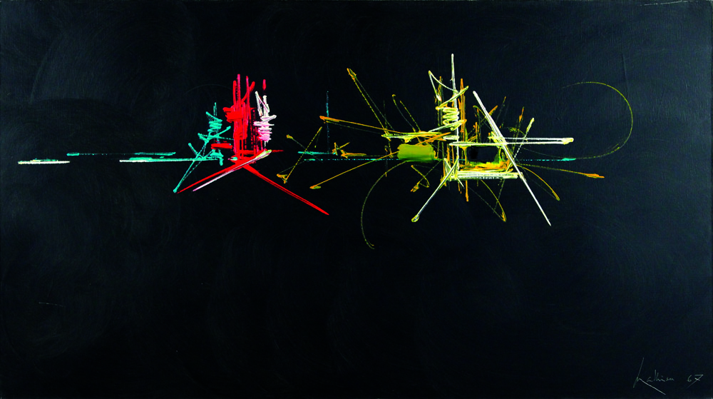 Mathieu Georges Astragale, 1967 olio su tela cm 73x130 firmato e datato in basso a destra, al retro etichetta Gimpell Fliss Gallery London, etichetta Pitt & Scott London, autentica dell'artista su fotografia datato gennaio '89