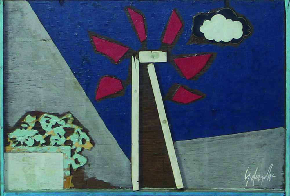 Dangelo Sergio Vicino a casa, (anni '60) olio e applicazioni su legno cm 27x40 firmato in basso a destra, firmato e intitolato al retro