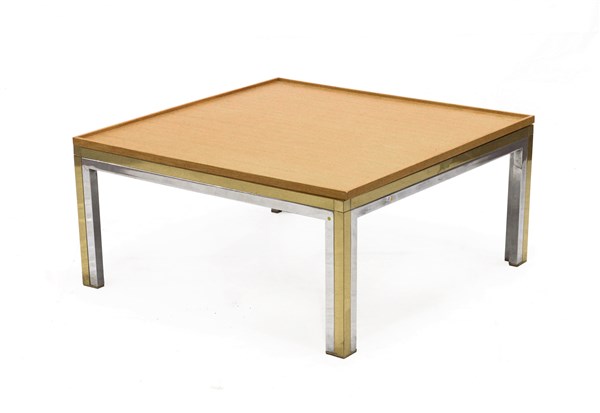 Tavolino da salotto con struttura in metallo argentato e ottone, piano in legno impiallacciato. Italia, anni '70. (cm 80x39,5x80) (lievi difetti)