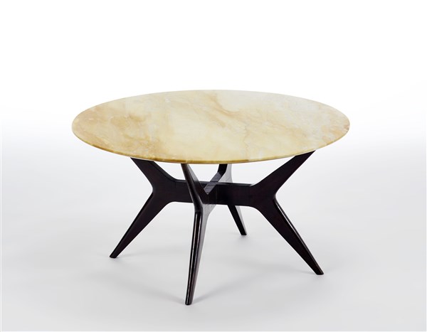 Coffee table with circular marble top and four-legged structure with solid wood cross. Italy, 1940s/1950s. (h 45 cm.; d 84.5 cm.) (defects)