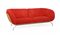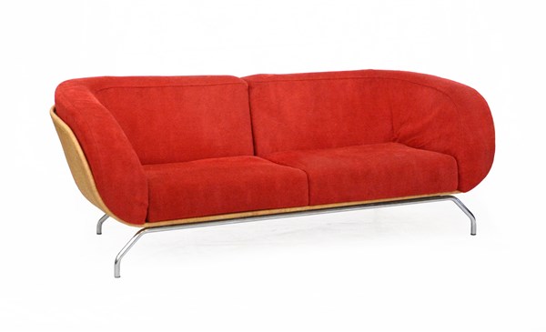 Divano con struttura in giunco, piedini in metallo cromato, seduta e schienale imbottiti e rivestiti in tessuto rosso. Italia, Anni duemila. (cm 200x69x95) (lievi difetti)