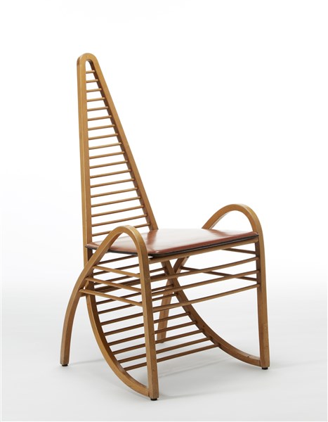 Una sedia in legno massello curvato con seduta in cuoio. Italia, anni '70. (cm 51x103x63) (difetti e mancanze)