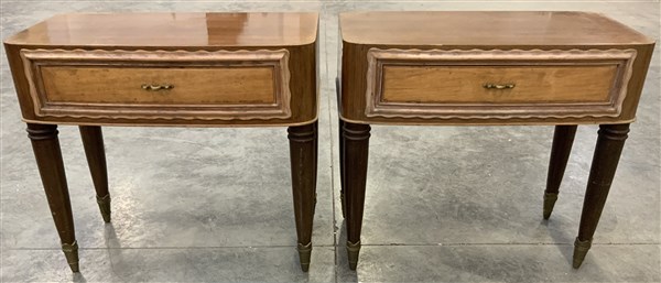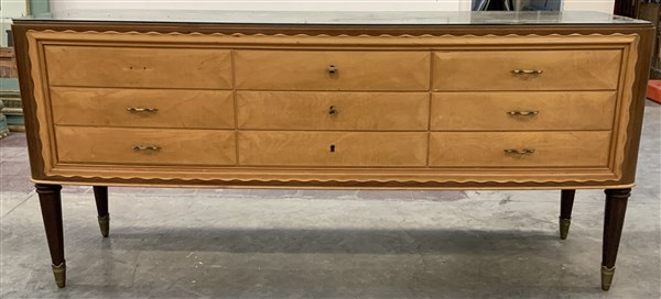 Fornitura da camera composta da una cassettiera a nove cassetti in legno impiallacciato in palissandro indiano e massello, cassetti e modanature in acero, maniglie e piedini in ottone, piano in cristallo molato unito a due comodini a un cassetto di analoga fattura. Italia, anni '50. (Cassettiera cm 186x86x52; comodini cm 59x52,5x32) (difetti e mancanze)