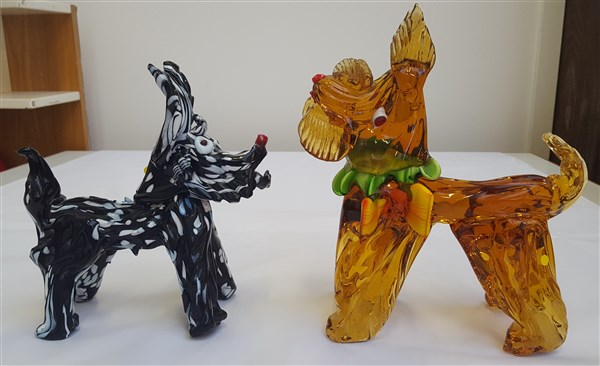 Coppia di cani in vetro massello ambra e in pasta vitrea nera. Secolo XX. (h cm 26 e h cm 22) (lievi difetti)