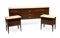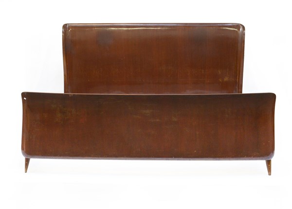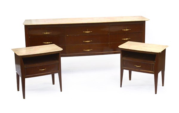 Arredo per camera da letto composta da un letto matrimoniale, una coppia di comodini, una cassettiera in legno di mogano impiallacciato, maniglie in ottone ripiani in marmo beige venato rosa. Italia, anni '50. (letto cm 200x103x183; comodini cm 55x53x34; cassettiera cm 180x75x49) (difetti)