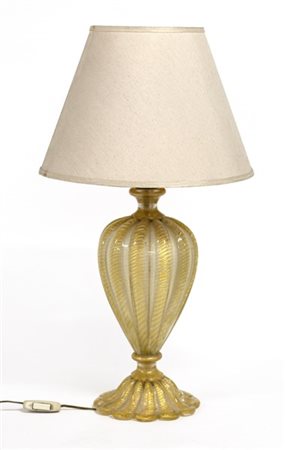 Lampada da tavolo a corpo costolato in vetro soffiato "Cordonato oro". Barovier & Toso, Murano, seconda metà secolo XX. Vetro incolore con inclusione di foglia d'oro. (h cm 38) (lievi difetti)