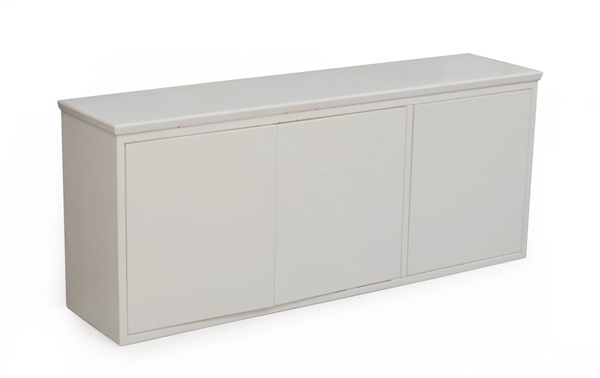 Libreria della serie "E22". Produzione Tecno, Varedo, anni '70. legno di teak impiallacciato e bordato struttura metallo nero a due campate con sei mensole a giorno con l'aggiunta di un mobiletto a tre ante in legno laccato bianco coevo realizzato su misura. (cm 143,5x285x29,5) (lievi difetti e modifiche)
