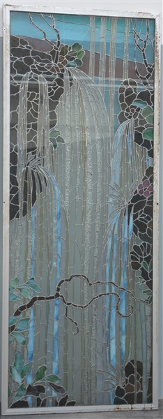 Grande vetrata Art Nouveau in vetro legato al piombo a motivi floreali con cornice in alluminio. (cm 220x90) (difetti)