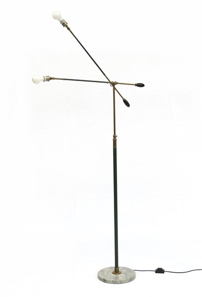 Lampada da terra in ottone, pelle verde e legno ebanizzato a due braccia regolabili. Base in marmo venato. Italia, anni '40. (h max cm 215) (lievi difetti e mancanze)