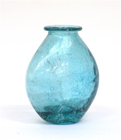 Vaso a corpo schiacciato in vetro trasparente verde acqua con applicazioni filiformi lattimo sulla superficie esterna. Italia, anni '90/2000. (h cm 30)
