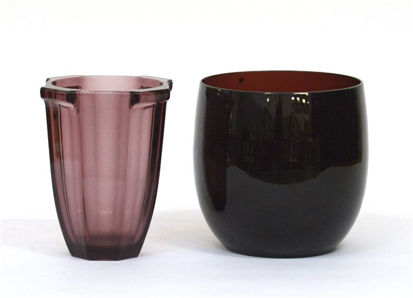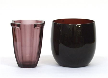 Lotto composto da una grande ciotola in vetro ametista scuro e un vaso costolato in vetro trasparente ametista chiaro. Seconda metà secolo XX. (h max cm 22) (difetti)