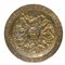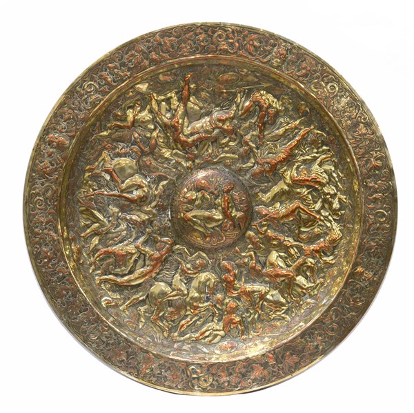Grande piatto da parata in rame argentato e sbalzato sul bordo a motivi vegetali, mascheroni e animali, nel cavetto con scene di battaglia. Sigliato al retro, fine del secolo XIX (d cm 68) (difetti)
