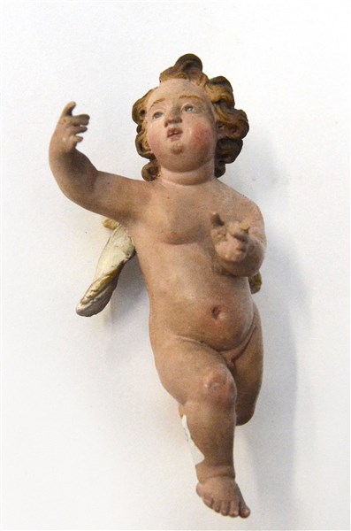 Manifattura napoletana, secolo XIX. Scultura da presepe raffigurante angelo con occhi in vetro (h. cm 13,4) (difetti)