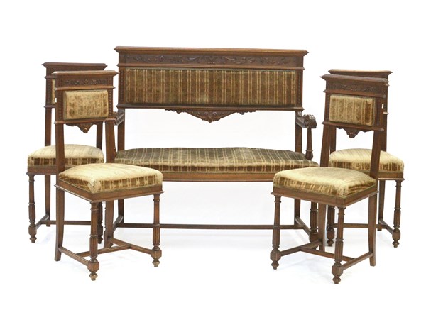 Fornitura da salotto composta da un divano e quattro sedie in legno intagliato con schienale dritto decorato a motivi floreali, gambe anteriori a colonna scanalata (difetti)