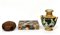 Lotto composto da una scatola lastronata in pietre dure, da una zucca incisa del secolo XIX e da un vaso biansato in ceramica policroma (difetti e mancanze)