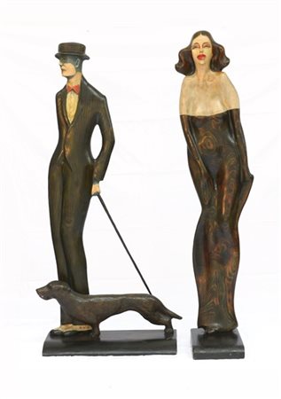 coppia di silhouette in legno laccato raffiguranti gentiluomo e gentildonna con cane