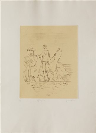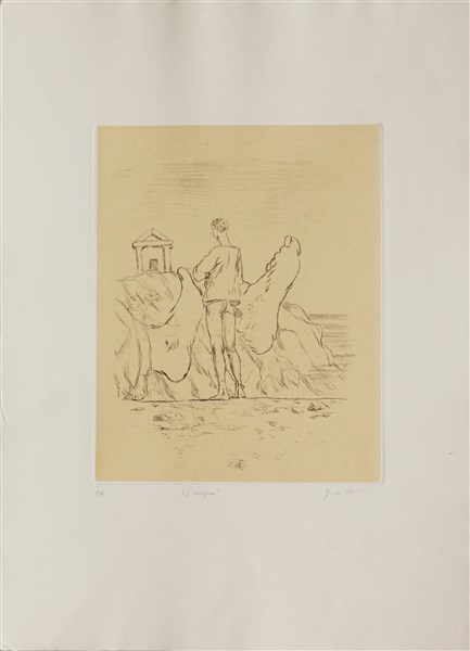Giorgio de Chirico "L'enigma" 1971 incisione a vernice molle (lastra cm 38,5x31;