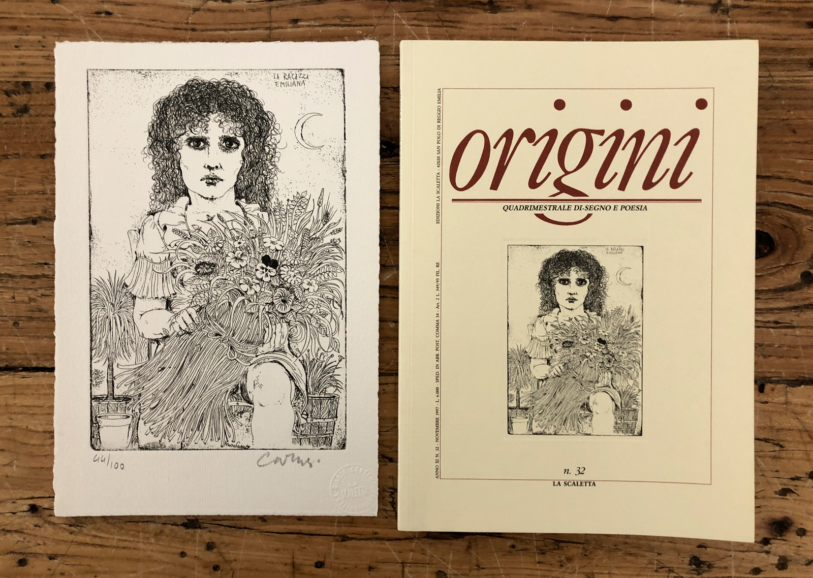 Il catalogo rientra nelle prime 100 copie realizzate e contiene al suo interno un'acquaforte di Bruno Caruso, dal titolo 'La ragazza emiliana', foglio cm 23,5x16, recante firma e numerazione (Esemplare 44/100) a matita e timbro a secco de La Scaletta al fronte
