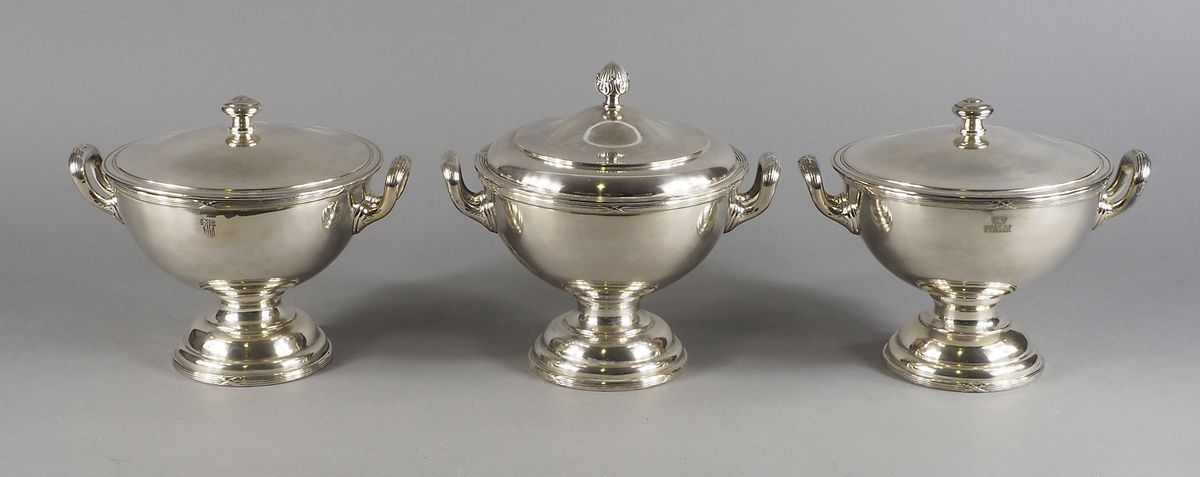 Lotto di 3 zuppiere in metallo con stemma Lloyd Triestino.