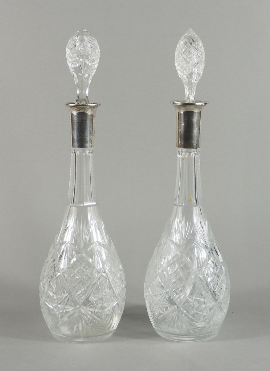 Coppia di bottiglie in cristallo lavorato con collo in argento. Austria,...