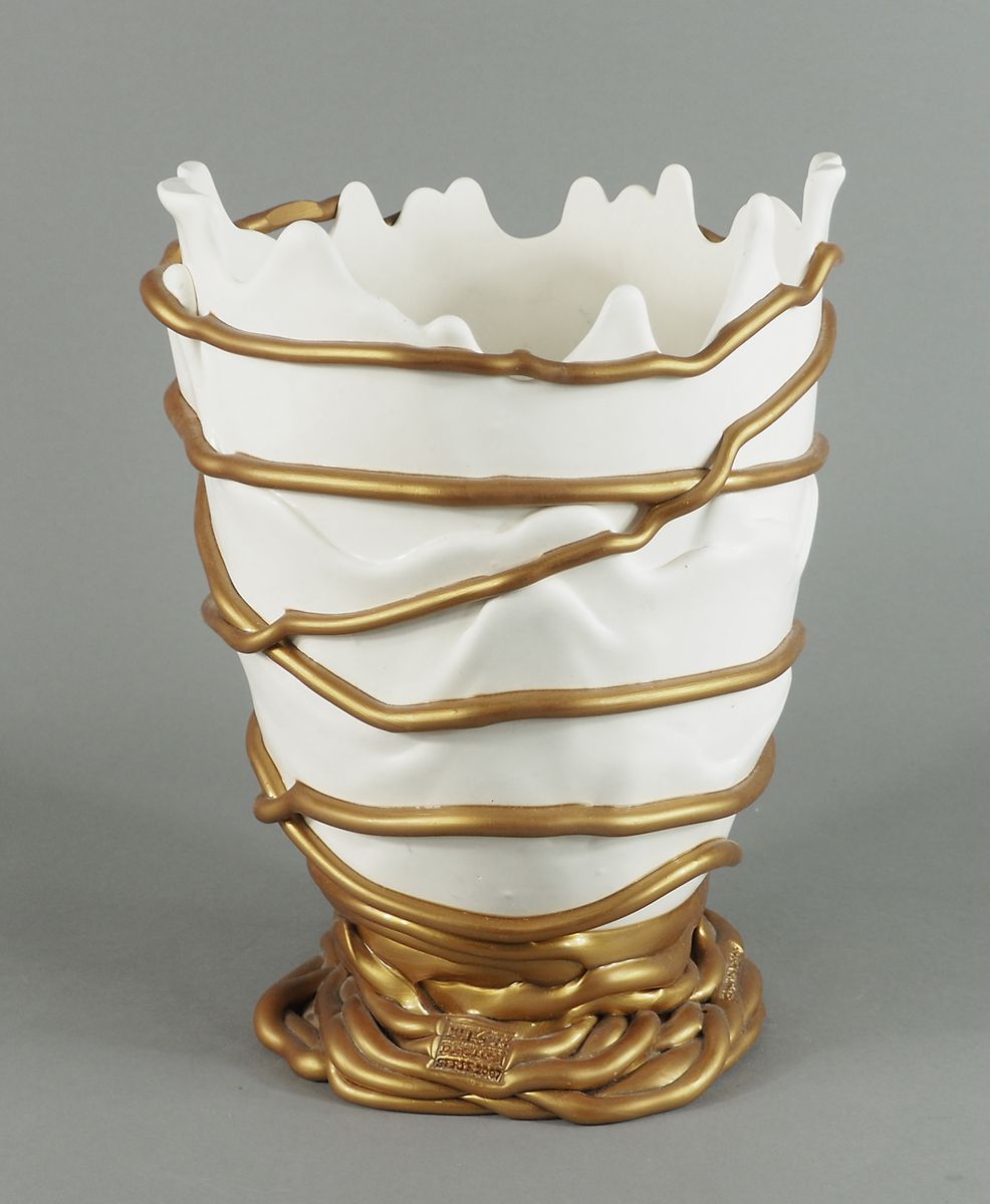 Vaso in resina flessibile bianca e oro modello Pompitu II, disegno di Gaetano Pesce, anni '90. H. cm. 33.