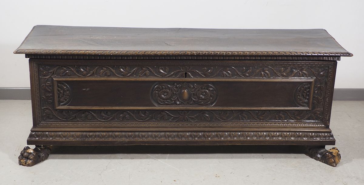 Lot 212 | Cassapanca con fronte scolpito, zampe ferine sul fronte. cm. 55x148x42.