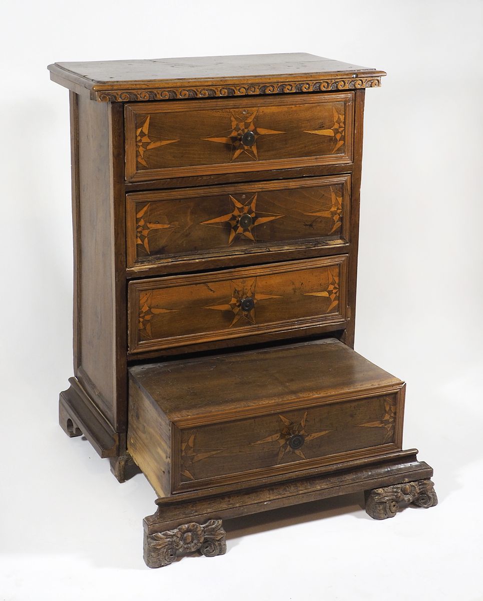 Piccolo cassettoncino in legno intarsiato a 4 cassetti di cui l'ultimo apribile a diventare inginocchiatoio. XVIII secolo.