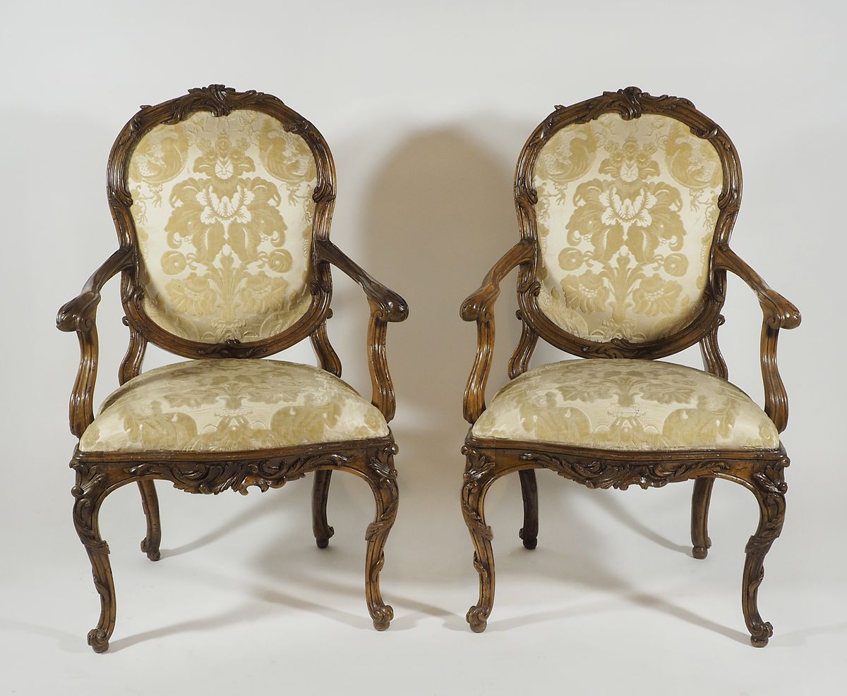 Lot 223 | Coppia di poltrone in legno finemente scolpito rivestite da stoffa floreale....