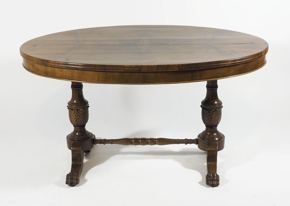 Tavolino basso in legno con piano ovale.