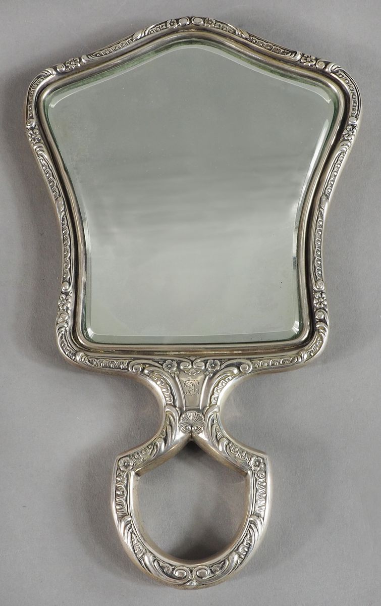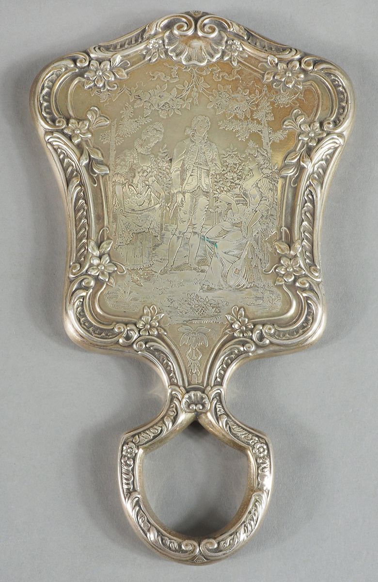 Gorham: specchietto sagomato in argento slbalzato, al centro incisa una scena galante. Inizio XX secolo. H. cm. 21.