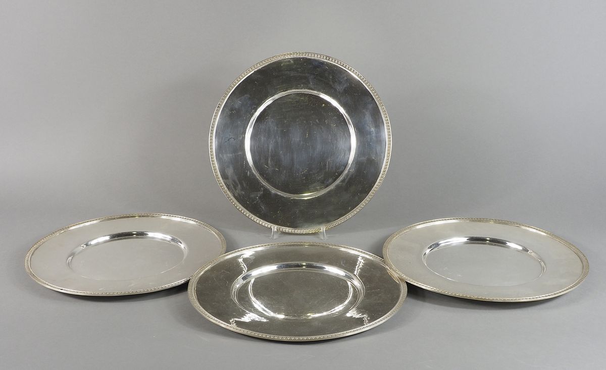 Lotto di 4 sottopiatti in argento con bordo sbalzato. Diam. cm. XX. gr. 2230.