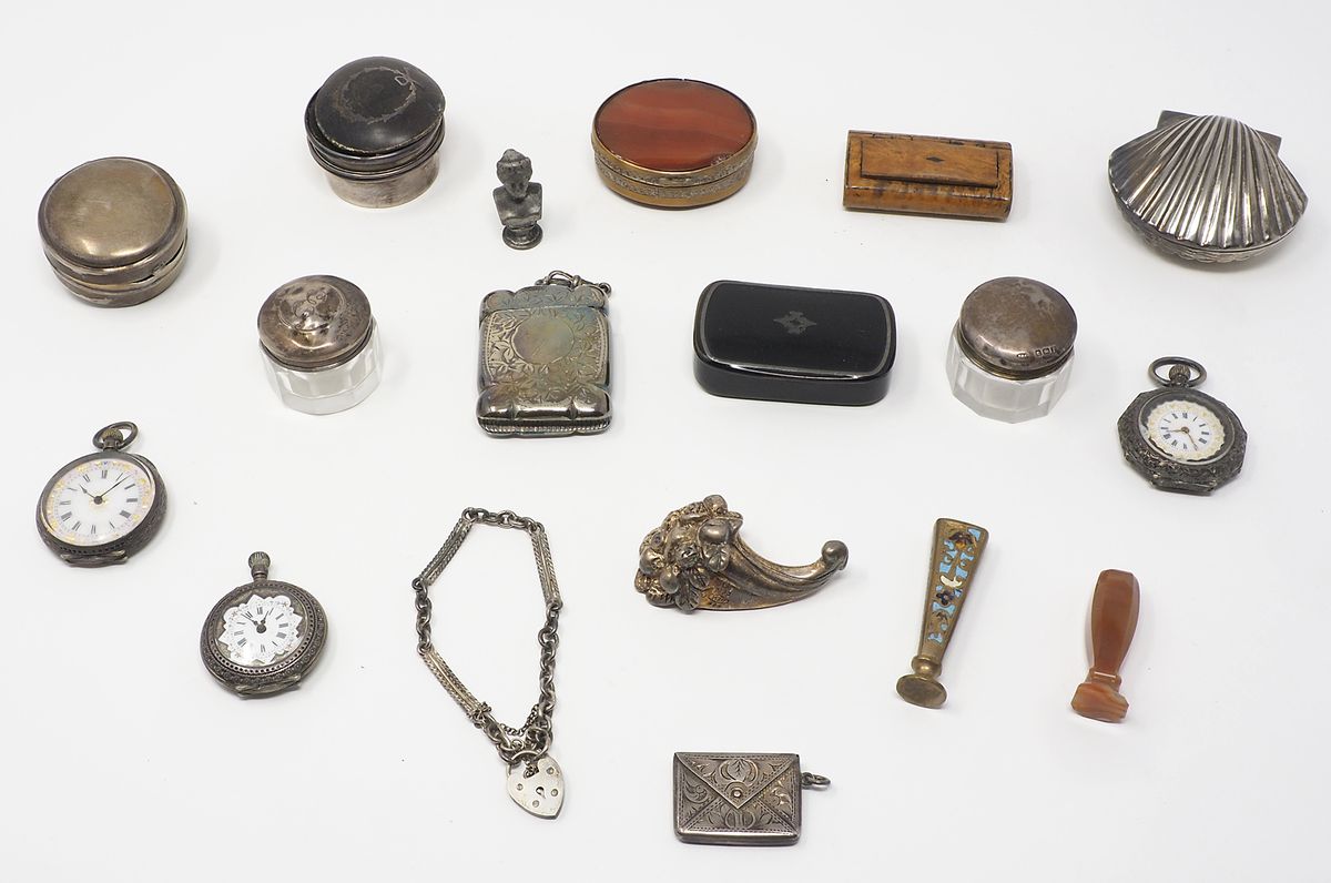 Lotto di vari oggetti tra cui orologi da tasca e scatolette, alcuni in argento.
