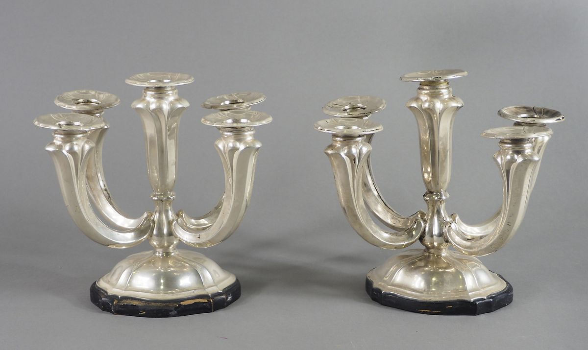 Lot 246 | Paio di candelabri in argento a 5 fiamme, su base in legno. H. tot cm. 20.