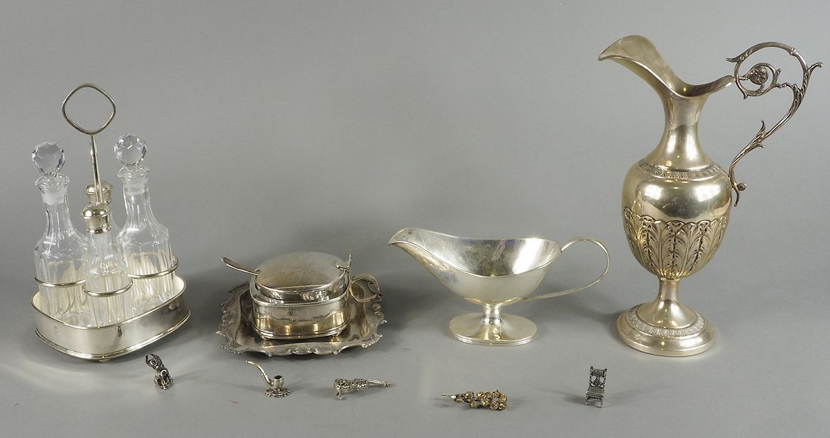 Lotto di vari oggetti in argeto tra cui brocca e salsiera. gr. tot 1400.