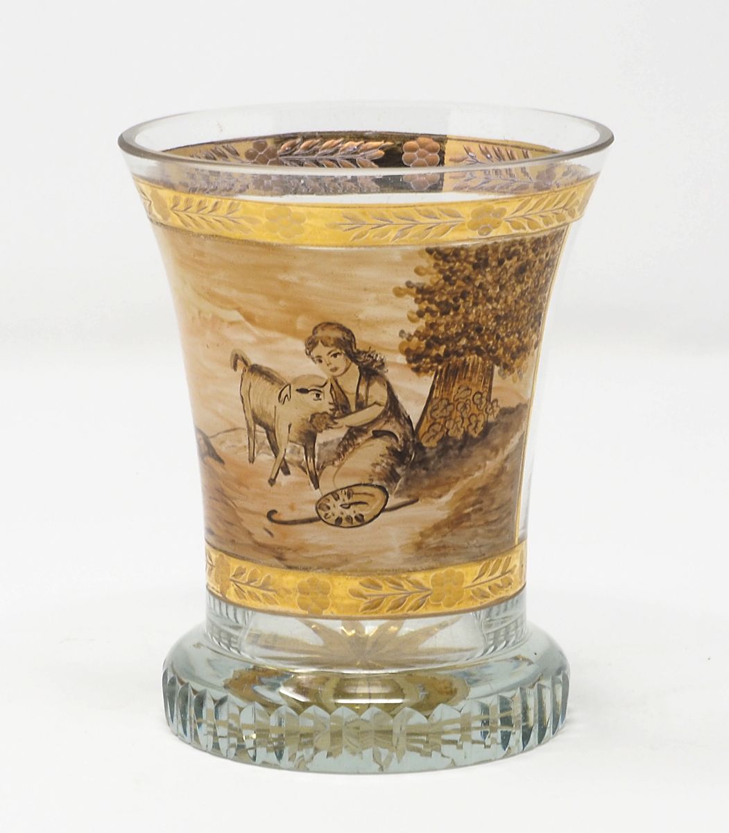 Bicchiere in cristallo di Boemia decorato con scena pastorale e bordo dorato....