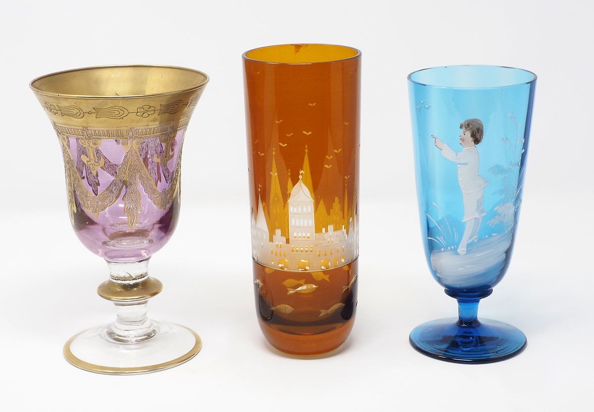 Lot 277 | Lotto di 3 bocchieri in vetro decorati con figura e paesaggi. H. max cm. 17,5.