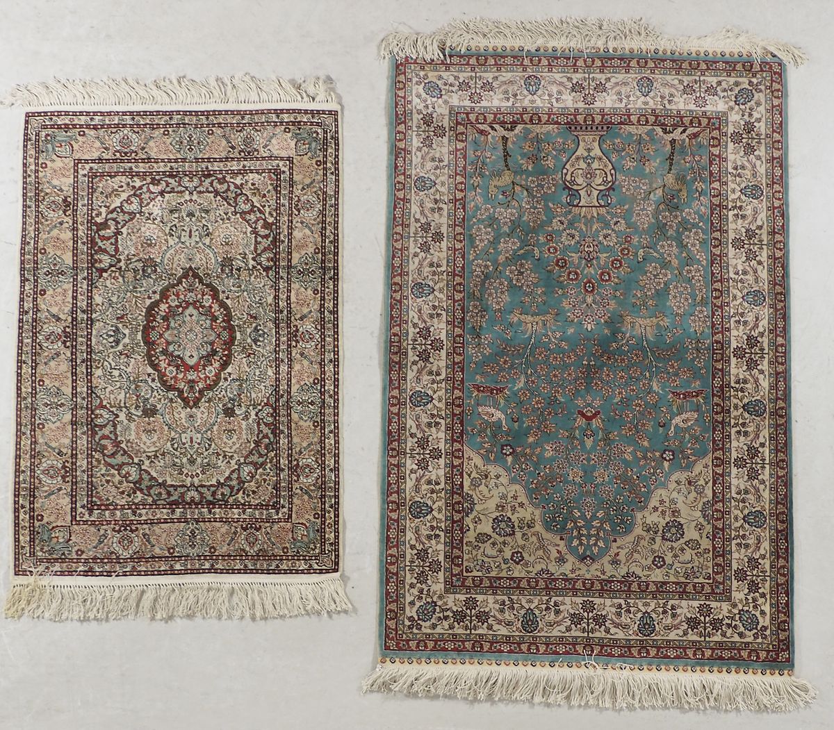 Lotto di 2 tappeti in seta, cm. 63x94 e cm. 78x123.