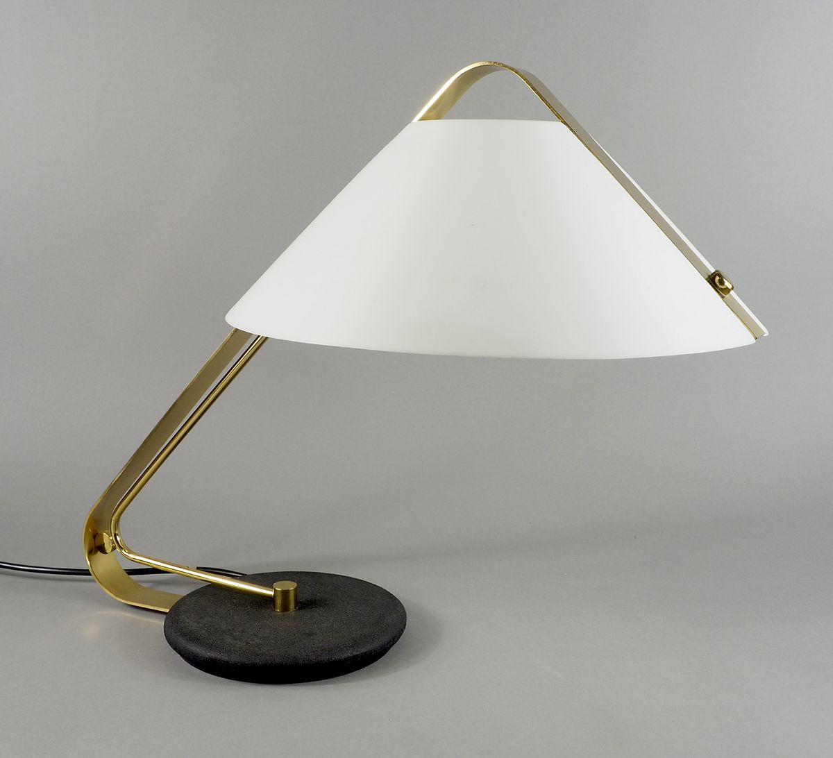 Lampada da tavolo in ottone con paralume bianco in plastica. Anni '80.