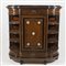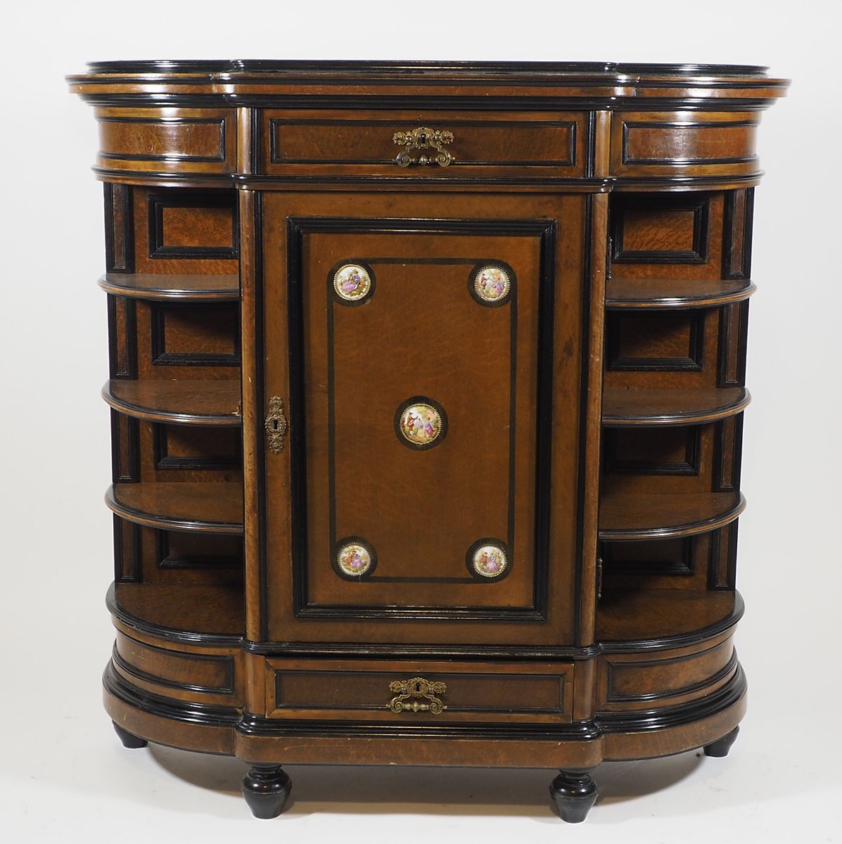Credenza in legno con bordi neri con anta, 2 cassetti e ripiani laterali, applicazioni di medaglioni in porcellana policroma. cm. 120x120x40.