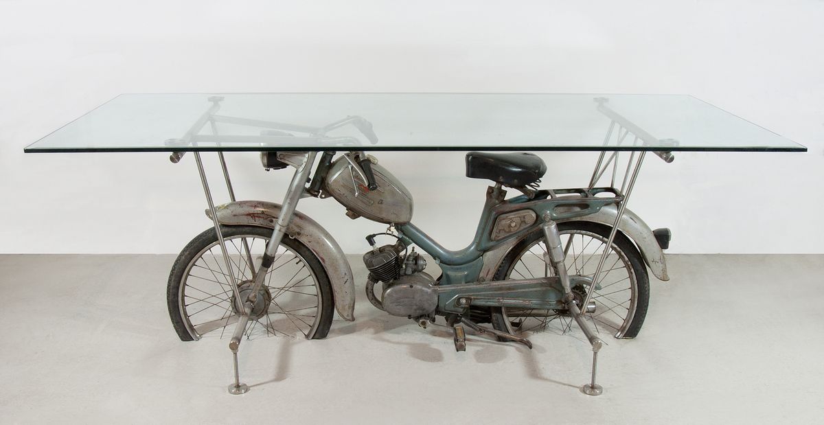 Tavolo da centro con piano in cristallo pogiante su ciclomotore anni '60. cm. 76x200x95.