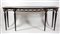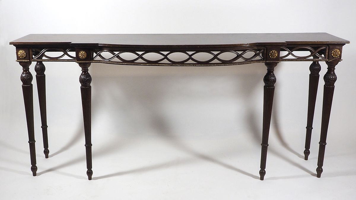 Lunga consolle in legno su alte gambe scanalate, bordo intagliato e dorato....