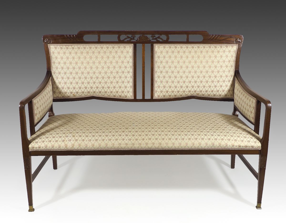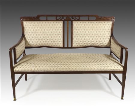 Divanetto in legno a 2 posti con schienale intagliato. Inizio XX secolo.